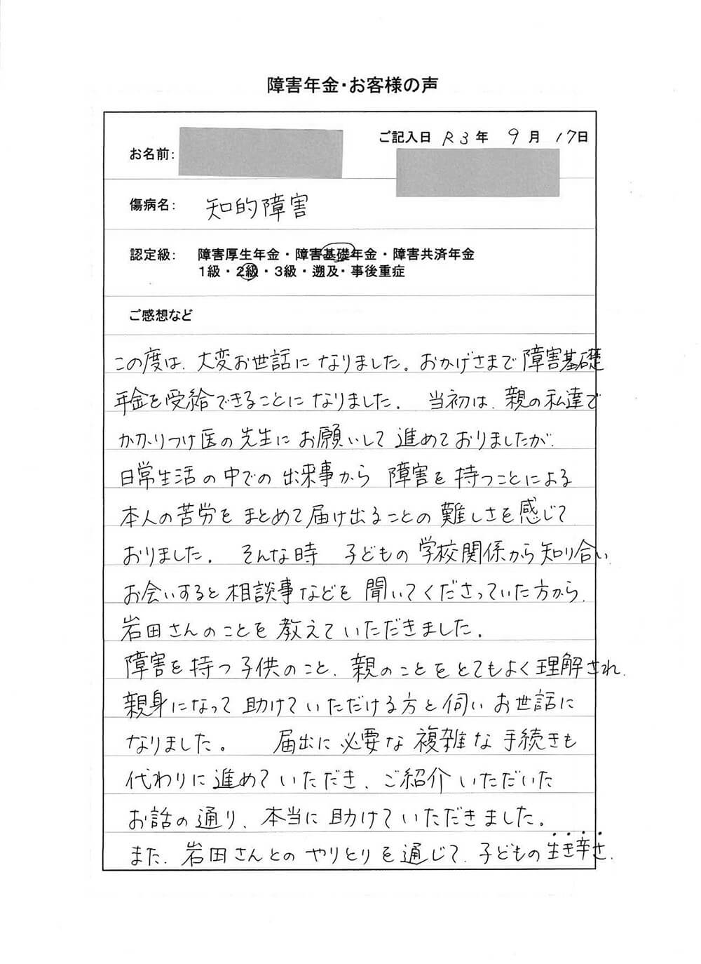 この度は、大変お世話になりました。おかげさまで障害基礎年金を受給できることになりました。当初は、親の私達でかかりつけ医の先生にお願いして進めておりましたが、日常生活の中での出来事から障害を持つことによる本人の苦労をまとめて届け出ることの難しさを感じておりました。そんな時子どもの学校関係から知り合い、お会いすると相談事などを聞いてくださっていた方から、岩田さんのことを教えていただきました。