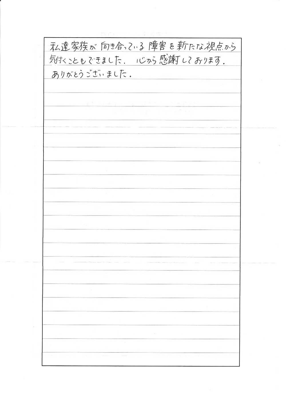 また、岩田さんとのやりとりを通じて、子どもの生き辛さ、私達家族が向き合っている障害を新たな視点から気付くこともできました。心から感謝しております。ありがとうございました。