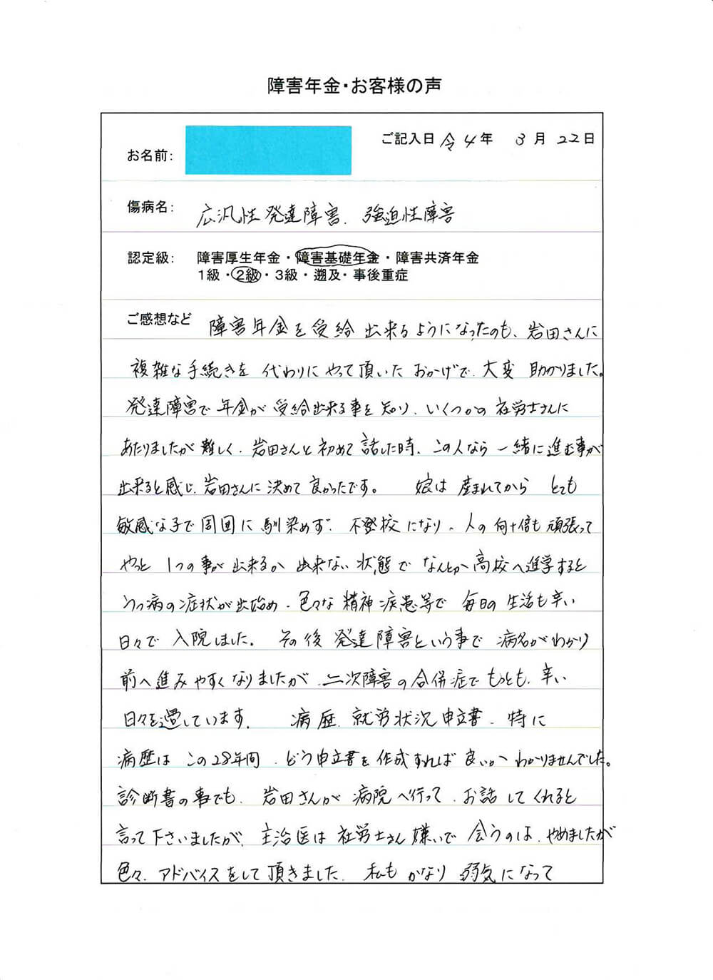 障害年金を受給出来るようになったのも、岩田さんに複雑な手続きを代わりにやって頂いたおかげで、大変助かりました。