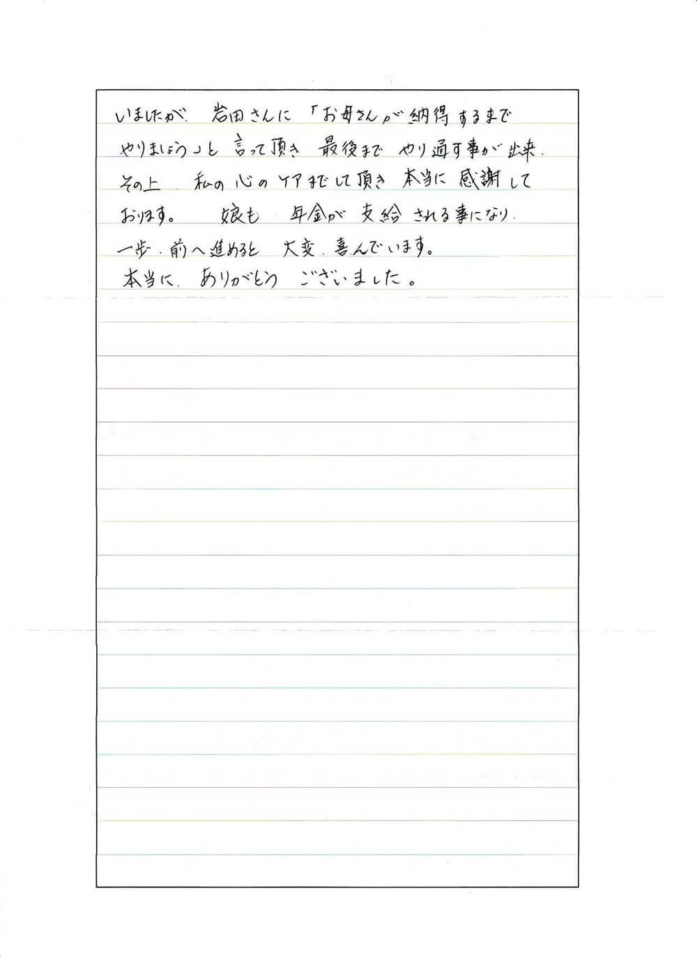 私もかなり弱気になっていましたが、岩田さんに「お母さんが納得するまでやりましょう」と言って頂き、最後までやり通す事が出来、その上私の心のケアまでして頂き本当に感謝しております。娘も年金が支給される事になり、一歩前へ進めると大変喜んでいます。